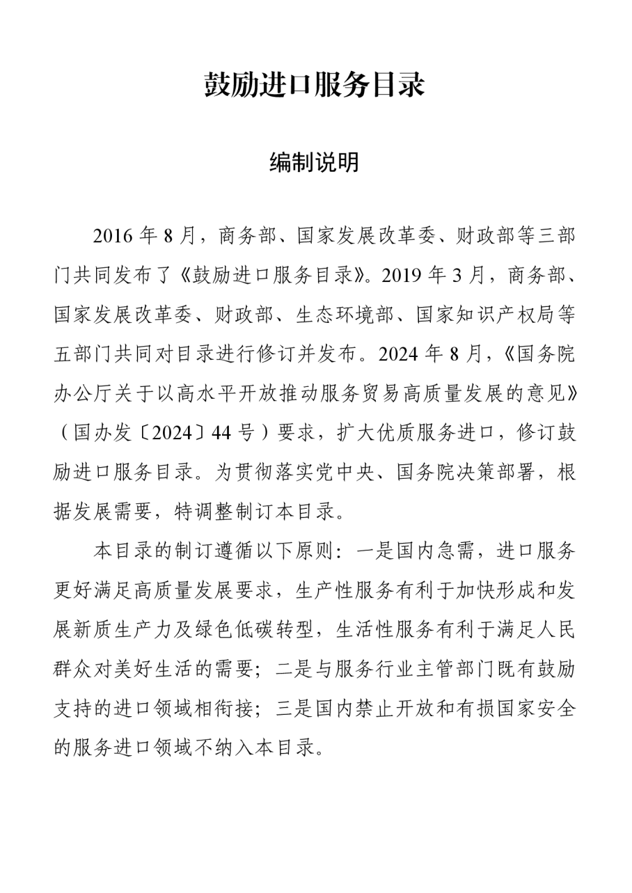 為貫徹落實(shí)黨中央、國(guó)務(wù)院關(guān)于主動(dòng)擴(kuò)大優(yōu)質(zhì)服務(wù)進(jìn)口的有關(guān)決策部署,商務(wù)部、國(guó)家發(fā)展改革委、工業(yè)和信息化部、生態(tài)環(huán)境部、住房城鄉(xiāng)建設(shè)部、國(guó)家衛(wèi)生健康委、國(guó)家知識(shí)產(chǎn)權(quán)局等部門調(diào)整了《鼓勵(lì)進(jìn)口服務(wù)目錄》,現(xiàn)予以公布。商務(wù)部、國(guó)家發(fā)展改革委、財(cái)政部、生態(tài)環(huán)境部、國(guó)家知識(shí)產(chǎn)權(quán)局2019年第14號(hào)公告同時(shí)廢止。